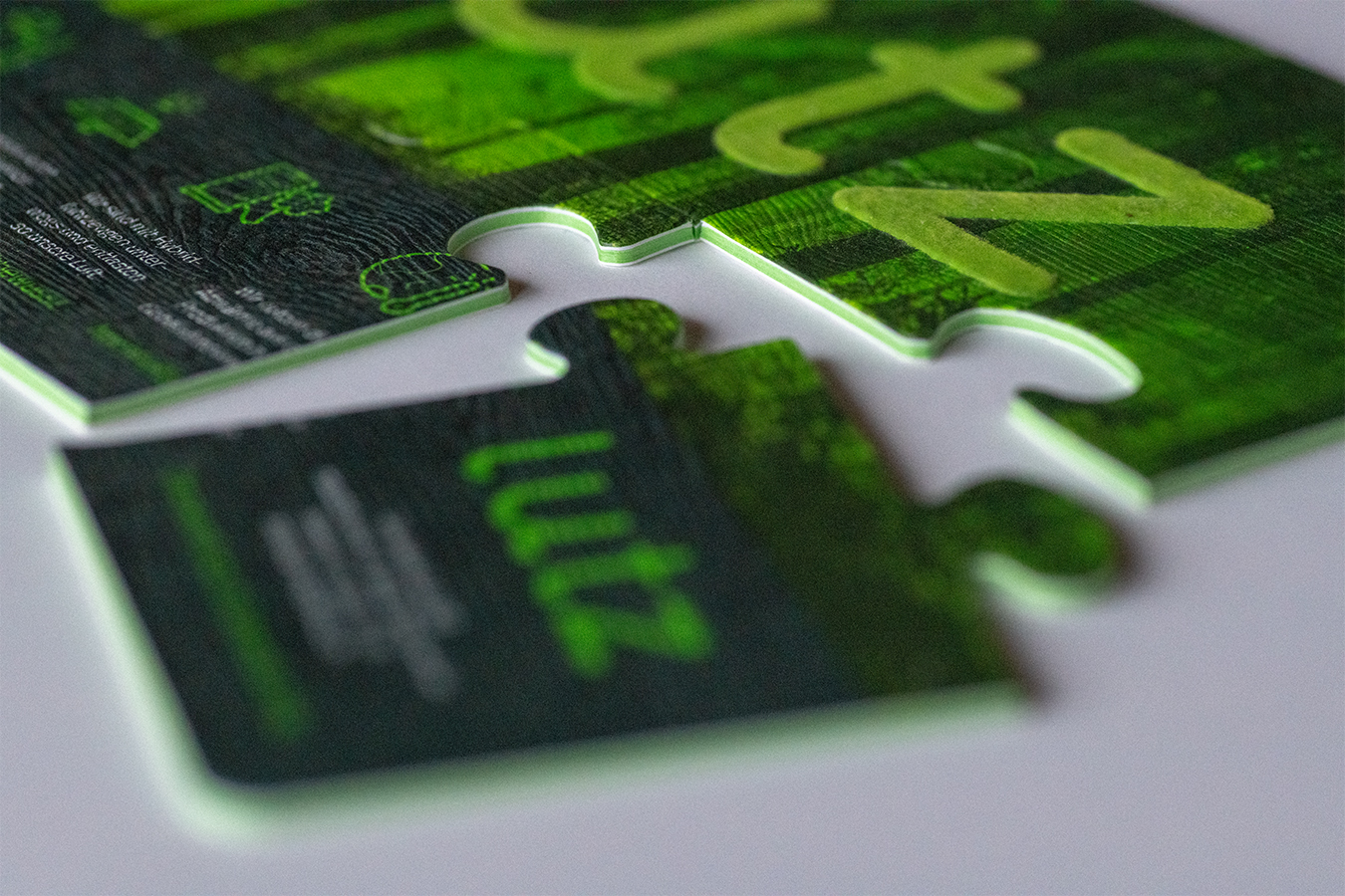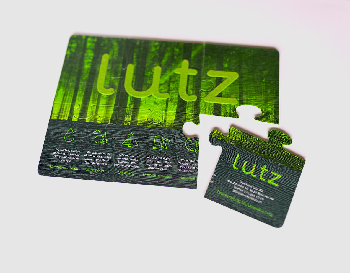 Für meinen Lehrbetrieb habe ich ein personalisiertes Informationsmailing gestaltet. Es besteht aus vier Lagen Papier. Die oberste Schicht aus einem Papier mit Holzstruktur, welche wir im Offset-Druckverfahren bedruckt haben, die Mitte aus zwei Lagen grünem Papier und die Rückseite aus naturweissem Halbkarton, den ich mittels Digitaldruck personalisiert habe. Anschliessend wurden alle Schichten kaschiert, auswärts das Logo mit grünen Fasern bestreut und bei uns zu einem Puzzle gestanzt.